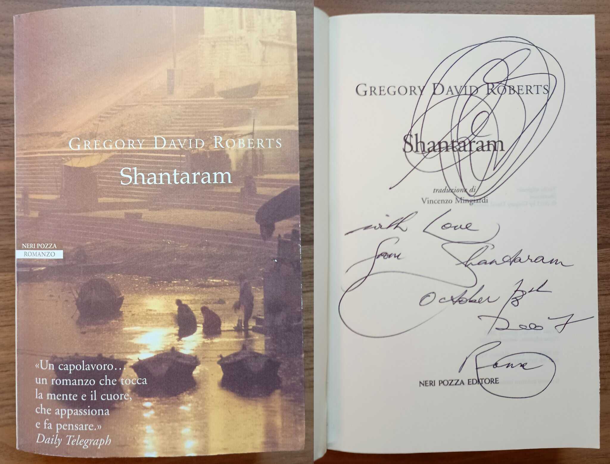 This signed copy of the Italian translation of Shantaram was obtained in person at a book signing held in the bookshop of the Auditorium Parco della Musica in Rome during the second edition of the Rome Film Festival in October 2007. Gregory David Roberts was an engaging presence at the event, attending a documentary about his book, and his inscription in this volume reflects the bold, sweeping style characteristic of his autograph. The signature is large and fluid, with dramatic loops and confident strokes that give it an expressive, kinetic quality. The personalised dedication – specifying time and place – adds further interest, capturing a moment from the author’s international promotional tour at a time when Shantaram had already achieved global cult status. A highly distinctive literary signature!